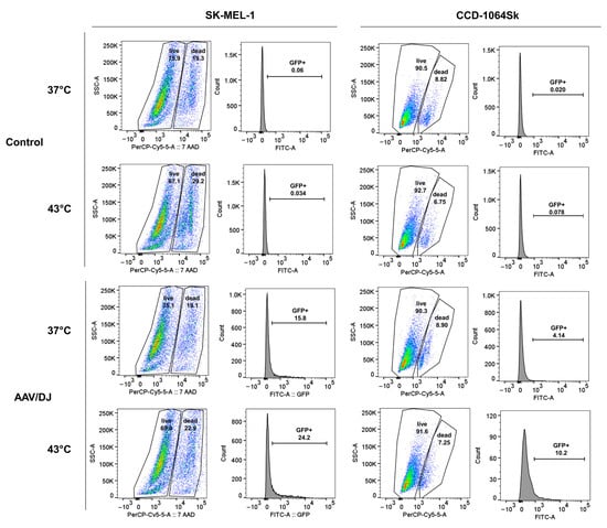Efficiency of transduction with the rAAV/DJ vector of the SK-MEL-1 melanoma cells and normal fibroblasts CCD-1064Sk under hyperthermia. Representative dot plots and histograms present the number of live and dead cells (%) and the number of GFP+ cells (%) for non-transduced cells (control) and transduced cells (rAAV/DJ) under standard conditions (37 °C) and under hyperthermia (43 °C). The percentage of GFP+ cells was measured in the population of live cells.