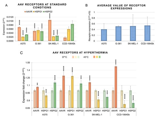 Expression of AAVR, HSPG1, and HSPG2 receptors for AAV in melanoma cells (A375, G-361, and SK-MEL-1) and normal fibroblasts (CCD-1064Sk). The results are presented as a mean of three independent repeats ± SD. (A) Expression levels (2−dCt) of receptors for AAV under standard conditions—constitutive levels. Statistically significant differences between CCD-1064Sk and cancer cells are marked with asterisks (**** p < 0.0001). (B) Averaged constitutive expressions (2−dCt) of receptors for AAV in the examined cells. The expression levels (2−dCt) of the three receptors were averaged for each cell line. (C) Changes in the expression (2−ddCt) of receptors after exposure to hyperthermia. For each receptor, lighter colors indicate expression at 37 °C and darker at 43 °C. Statistically significant differences between 37 °C and 43 °C are marked with asterisks (** p < 0.01; *** p < 0.001; **** p < 0.0001).
