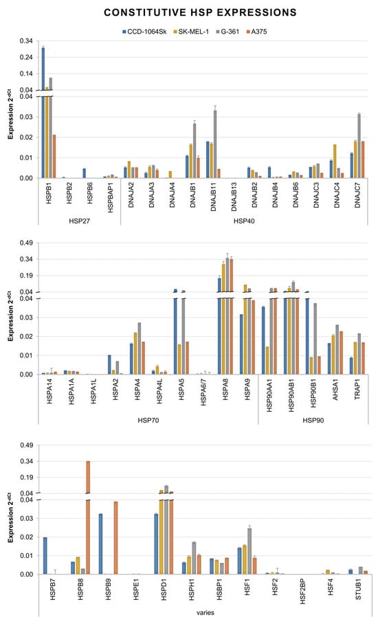 Signatures of the constitutive expression (cells not exposed to hyperthermia) of genes encoding HSPs in A375, G-361, and SK-MEL-1 melanoma cells and normal skin fibroblasts CCD-1064Sk. Results (2−dCt) are presented as a mean of two biological repeats ± SD. The analyzed HSPs were grouped into the subfamilies HSP27, HSP40, HSP70, and HSP90, and varies.