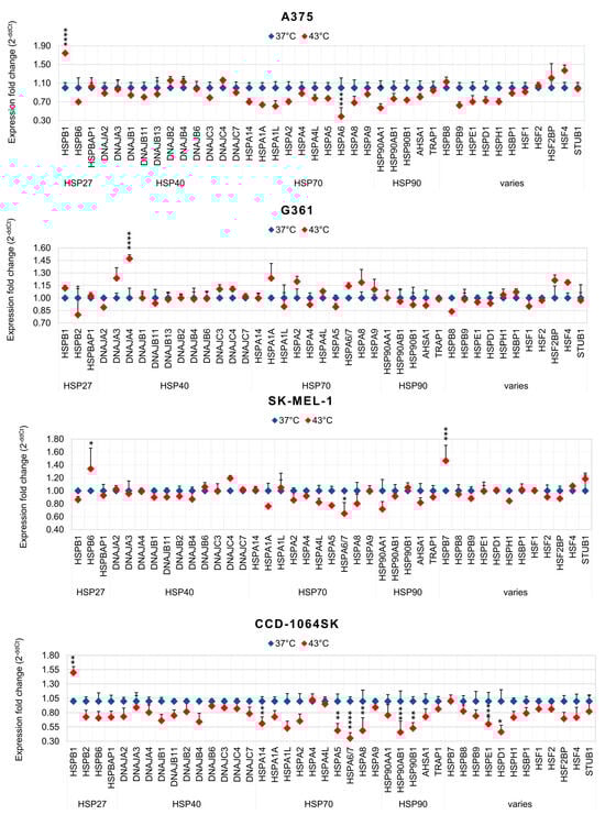 Changes in HSP gene expression in melanoma cells (A375, G-361, and SK-MEL-1) and normal fibroblasts (CCD-1064Sk) exposed to hyperthermia. Results (2−ddCt) are presented as a mean of two biological repeats ± SE. Values of expression at 37 °C are marked with blue dots and after exposure to hyperthermia (43 °C) with red dots. Statistically significant differences between 37 °C and 43 °C are marked with asterisks (* p < 0.05; ** p < 0.01; *** p < 0.001; **** p < 0.0001).