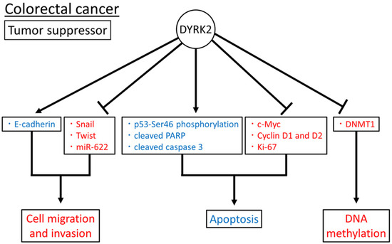 Together, DYRK2 as a tumor suppressor may induce apoptosis by inducing p53-Ser46 phosphorylation; cleaved PARP and caspase 3; the suppression of c-Myc, Cyclin D1 and D2, and Ki-67 expression; the inhibition of cell migration and invasion by regulating E-cadherin, Snail, Twist, and miR-622 expression; and the regulation of DNA methylation by DNMT1 expression (Figure 1). The role of DYRK2 in colorectal cancer has been investigated in tissue samples, cell lines, and xenograft mouse models. However, to date, no such studies have been conducted using genetically modified mice.