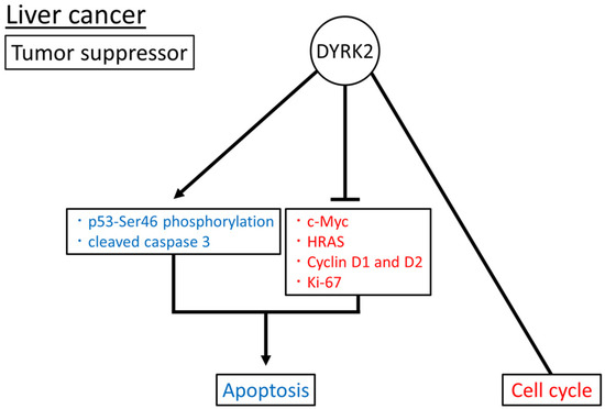 Overall, DYRK2, as a tumor suppressor, may induce apoptosis by inducing cleaved caspase 3 and p53-Ser46 phosphorylation; suppressing c-Myc, HRAS, Cyclin D1 and D2, and Ki-67 expression; and regulating the cell cycle (Figure 2). The role of DYRK2 in liver cancer has been investigated in patient tissue samples, cell lines, xenograft mouse models, and genetically modified mouse models.