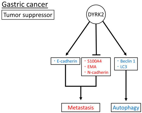 Taken together, DYRK2, as a tumor suppressor, may inhibit metastasis by inducing E-cadherin expression, suppressing S100A4, EMA, and N-cadherin expression, and promoting autophagy by increasing Beclin1 and LC3 expression (Figure 3). The role of DYRK2 in gastric cancer has been investigated in patient tissue samples, cell lines, and xenograft mouse models. However, to date, no such studies have been conducted using genetically modified mice.