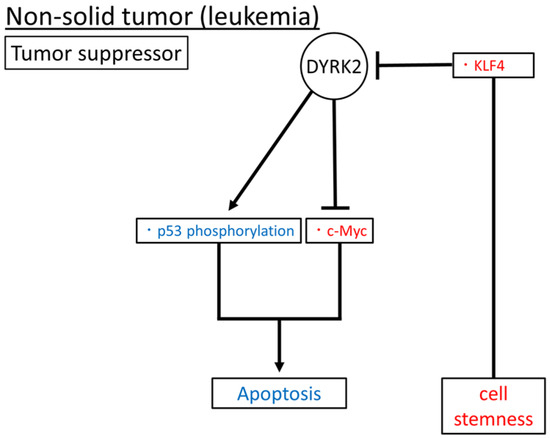 DYRK2 levels are low in chronic myeloid leukemia (CML) cell lines (K562, KU-812, and KBM5), whereas DYRK2 expression is high in hematopoietic stem cells (lineage-negative Sca-1+ c-Kit+ (LSK) cells) from Krüppel-like factor 4 (KLF4) knockout mice [12]. KLF4 regulates stem cell self-renewal and reprogramming [26,27,28,29,30,31,32]. KLF4 inhibits DYRK2 gene expression by binding to the endogenous DYRK2 promoter and plays a role in maintaining c-Myc expression in CML stem/progenitor cells [12]. In addition, DYRK2 upregulation induces p53 phosphorylation at Ser46 and reduces c-Myc protein levels in mouse LSK [12]. Therefore, DYRK2 may play a role in the self-renewal and survival of stem/progenitor cells.