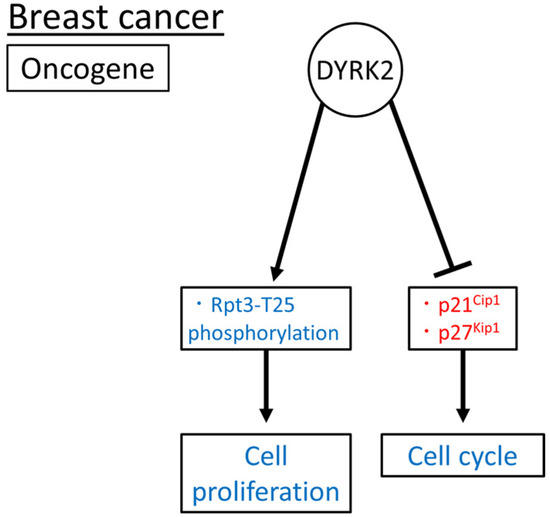 Taken together, DYRK2, an oncogene, may induce cell proliferation via Rpt3-T25 phosphorylation and promote cell cycle progression by downregulating p21Cip1 and p27Kip1 (Figure 6). The role of DYRK2 in breast cancer has been investigated in tissue samples, cell lines, and xenograft mouse models. However, to date, no such studies have been conducted using genetically modified mice.
