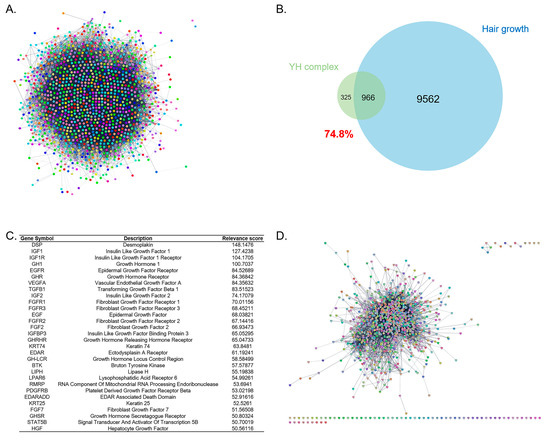 Network analysis of the combination of Astragalus membranaceus and Cinnamomum cassia, consisting of YH complex. (A) Whole network of the YH complex-targeted 1291 genes containing 1271 nodes and 30,230 edges. Blue, cooccurrence; light green, textmining; sky blue, databases; purple, experiments; black, coexpression; green, neighborhood; red, fusion. (B) Venn diagram of the YH complex and hair growth gene set. (C) Top 30 target genes of ‘Hair growth’ gene set. (D) Network of 966 common genes of the YH complex and the hair growth gene set.