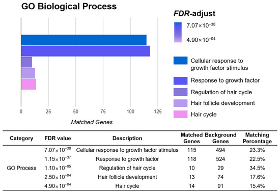 Predicted functional biological terms of common genes of YH complex and hair growth gene set. The target pathway was listed from the GO Biological Process database. According to the score of FDR value, the description was listed and matching percentage was calculated.