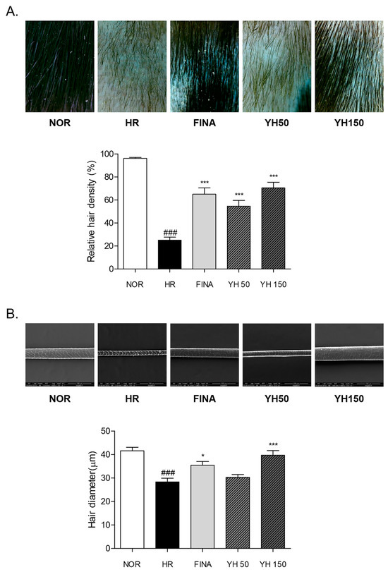 Hair regrowth rate of dorsal skin tissues. (A) Skin color and hair density monitored by dermoscope. The relative hair densities per unit area were measured. (B) Scanning electron microscopy (SEM) analysis of hair shaft. The hair diameter of hair shaft was calculated. Results are presented as mean ± standard error of the mean. ### p < 0.001 vs. NOR group; * p < 0.05 and *** p < 0.001 vs. HR group. HR, hair removal; FINA, finasteride; YH, YH complex.