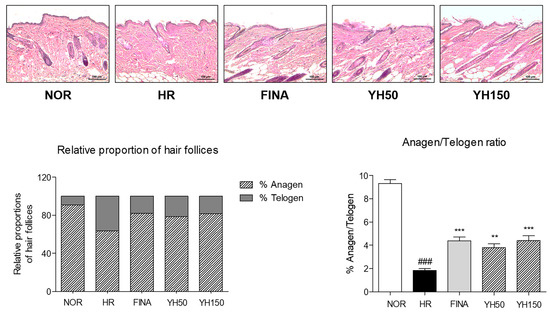 Histological changes of hair follicles of dorsal skin tissues. Hair regrowth of dorsal skin tissues monitored by H&E staining. The number of anagen and telogen phase hair follicles was counted, and then the relative proportion of hair follicles and anagen/telogen ratio were quantified. Results are presented as mean ± standard error of the mean. ### p < 0.001 vs. NOR group; ** p < 0.01 and *** p < 0.001 vs. HR group. HR, hair removal; FINA, finasteride; YH, YH complex.