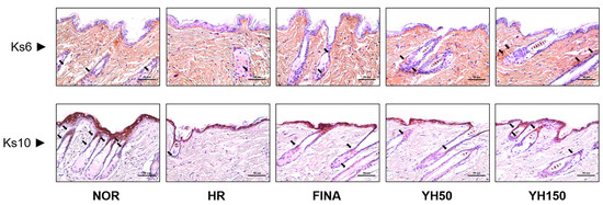 The expression of keratin in the hair follicle by IHC staining. Black arrows indicate each expression of Ks6 and Ks10. HR, hair removal; FINA, finasteride; YH, YH complex.