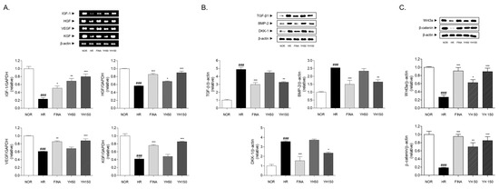 The expressions of growth factors and signaling-pathway-related molecules in skin tissues. (A) The mRNA expressions of growth factors including IGF-1, HGF, VEGF, and KGF. (B) The protein expressions of BMP-2/TGF-β signaling pathway and DKK-1. (C) The protein expressions of Wnt/β-catenin signaling pathway. Results are presented as mean ± standard error of the mean. ### p < 0.001 vs. NOR group; * p < 0.05, ** p < 0.01, and *** p < 0.001 vs. HR group. HR, hair removal; FINA, finasteride; YH, YH complex.