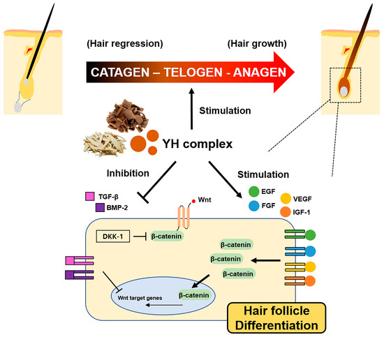 Numerous signaling pathways interact with one another by forming a regulatory complex crucial for the growth and maintenance of hair [37]. In particular, the Wnt/β-catenin signaling pathway is considered the main target for hair follicles development, transitioning from the resting telogen stage to the growing anagen stage [34]. It plays a vital role in the process of hair follicles differentiation with the regulation of various cytokines and growth factors [38]. The growth factors, including IGF-1, HGF, VEGF, and KGF, affect the growth of hair follicles, and are involved in the regulation of hair morphogenesis and the hair cycle. IGF-1 secretion in a paracrine manner in the dermis induces epidermal cell proliferation and participates in the development of skin [39]. Additionally, IGF-1 has been found to inhibit apoptotic factors in the regression–catagen phase [40]. It is known that HGF and VEGF have great importance in the development and differentiation of hair. There are reports that HGF stimulates the development of hair follicle in mouse vibrissae and human scalp hairs [41]. It induces and preserves the anagen phase in hair follicles of mice. HGF and VEGF promote the hair growth by perifollicular vascularization and angiogenesis [42]. On the other hand, KGF, also as known as FGF-7, has been known to stimulate the elongation of hair fibers and inhibit the transition from anagen to catagen of the hair cycle [43]. The mRNA expressions of those growth factors including IGF-1, HGF, VEGF, and KGF were dose-dependently increased by the treatment of the YH complex. The elevated growth factors interact with the release of β-catenin in hair growth or hair loss; likewise, DKK-1 inhibits Wnt action in hair follicles [44]. Separated β-catenin from the Wnt/β-catenin complex translocates to the nucleus to initiate the regeneration of hair follicles and induce the onset of anagen phase [45]. During these processes, the AKT/PI3K signaling pathway and the MAP kinase signaling pathway are simultaneously involved in the phosphorylation of GSK3β, resulting in the promotion of β-catenin release [44]. The Wnt and β-catenin expressions in skin tissues were apparently increased, while the DKK-1 expression was declined by the administration of the YH complex. Moreover, studies suggested that the BMP/TGF-β signaling pathway inhibited the hair growth [46]. BMP-2 is expressed in the late growth period, thus acerbating the transition to catagen phase [47]. The YH complex effectively inhibited the expressions of BMP-2 and TGF-β in the skin of depilated hair loss mice. These results demonstrate that the growth factors elevated by the YH complex induced β-catenin translocation into the nucleus, leading to the hair follicle differentiation and development in hair loss mice. The inhibitory properties of the BMP/TGF-β signaling pathway against hair growth were decreased by the YH complex. Eventually, the YH complex exhibited hair-growing effects via promotion of the Wnt/β-catenin signaling pathway and inhibition of the BMP/TGF-β signaling pathway, thereby increasing the expression of keratin 6 and 10, indicators of hair growth, and the formation of anagen hair follicles (Figure 7).