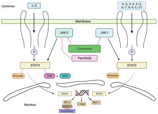 JAK/STAT pathway is activated via Janus kinase/signal and heavily contributes to tumorigenic functions, including proliferation, anti-apoptosis, angiogenesis, stem cell maintenance, and immune suppression [73,74,75,76]. JAK-mediated pathway is activated when cytokines bind to JAK receptors located on the cell membrane, followed by receptor dimerization and cytoplasmic tail phosphorylation (Figure 1). The JAK family consists of non-receptor protein tyrosine kinases (PTKs), which include JAK1, JAK2, JAK3, and Tyk2 [70,77]. These kinases are upstream of STAT3 and are involved in the signal transduction of cytokines [70]. STAT proteins have SH2 domains that contain tyrosine phosphorylation sites, and their phosphorylation allows STAT to form dimers and alters STAT protein conformation to facilitate their DNA binding [78]. After tyrosine phosphorylation, STAT is translocated into the nucleus. In the nucleus, STAT proteins bind DNA elements and regulate the transcription of associated genes, such as Bcl2, c-Myc, and Mcl-1 [78,79,80]. The STAT family is composed of seven members, which include STAT1, STAT2, STAT3, STAT4, STAT5A, STAT5B, and STAT6 [81]. STATs 1, 2, 4, and 6 play limited roles, while STAT3 and STAT5 are involved in more functions, such as resistance to treatments [82,83]. STAT3 serves as an intracellular signaling hub and can be activated when JAK2 is stimulated by various cytokines (IL-6) and growth factors. Once JAK2 is activated, it can phosphorylate STAT3 at the tyrosine 705 residue [73,84]. STAT3 is the primary transcriptional regulator of autophagy genes in the nucleus [70,85], and it can inhibit autophagy via the upregulation of BCL2 [85]. Experimental evidence has shown that the inhibition of STAT3 leads to autophagy upregulation [85]. STAT3 has been observed in glioblastoma multiforme (GBM), and STAT3 activation is correlated with a poor prognosis in GBM [86].