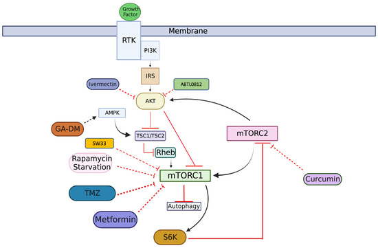Induction of autophagy by inhibiting the PI3K/AKT/mTOR pathway. The PI3K/AKT/mTOR pathway is activated when growth factors activate Receptor Tyrosine Kinase (RTK), which then leads to activation of PI3K. The drugs affecting the PI3K/AKT/mTOR pathway are listed within the figure and include rapamycin, curcumin, ganoderic acid DM (GA-DM), ivermectin, ABTL0812, metformin, SW33, and temozolomide (TMZ). Rapamycin, TMZ, metformin, and SW33 inhibit mTORC1, which leads to autophagy induction. Curcumin inhibits mTORC2, which promotes induction of autophagy. GA-DM activates AMPK, which leads to activation of TSC1/TSC2 and, ultimately, autophagy induction. Ivermectin and ABTL0812 inhibit AKT, which leads to autophagy induction as well.