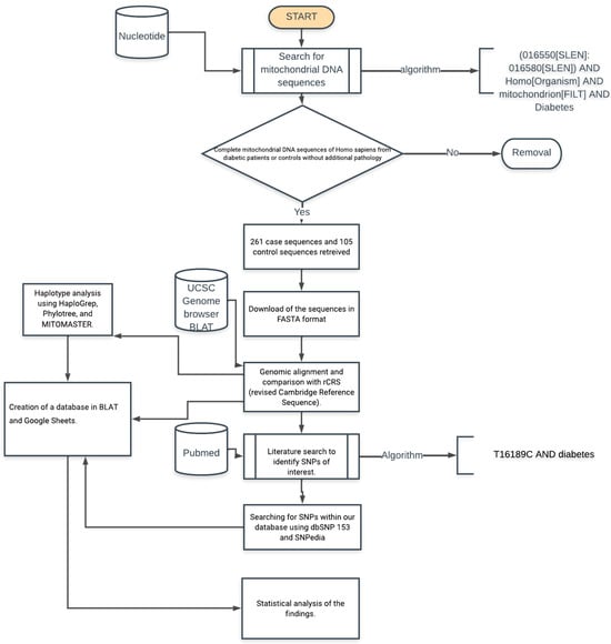 Once the sequences were identified in the database, the metadata associated with each of them were explored to validate the place of origin; the following were required as inclusion criteria: (1) sequence length of 16,569+/−10 bp, (2) Homo sapiens species tag, (3) type 2 diabetes diagnostic tag or defined as non-insulin-dependent, (4) tag of origin of the sequence as a control grade individual in a study published on T2D or defined as non-insulin-dependent, and (5) reference citation of the article associated with the study of the origin of the sequence, eliminating all those who did not meet any inclusion criteria. In cases where the metadata tags of each individual were not clear enough to distinguish between diabetic and control cases, the first author of each study was contacted via email, to provide the specific criteria that they used to classify each individual.
