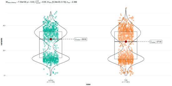 When analyzed individually by separate groups and plotted using frequency histograms of the variant counts per sequence, this bimodal distribution was maintained in diabetics and controls, so it was not an effect related to differences in the frequencies between the two groups. With the Levene test to explore the homoscedasticity of the same data, their variances were homogeneous, with an F statistic value of 2.21 and a value of p equal to 0.14. Finally, in the Mann–Whitney test, we demonstrated a significant difference when comparing the median of variants’ frequency in the diabetic group with controls (Figure 2).