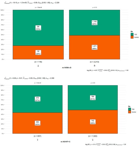 Of the 13,907 SNPs (7087 in T2D and 6820 in controls) identified in the sequences after comparison against the rCRS, 64% were found to be associated with only five variants (8901 of which 4536 were in T2D cases and 4365 in T2D cases), occupying two thirds of all the polymorphisms observed in all the samples analyzed. The five most frequently shared polymorphisms were m.1438A>G (rs2001030), found in people with diabetes in 97.0% (1071/1104) of diabetic cases and 90.6% (1142/1105) of controls (Figure 3); m.750A>G (rs2853518), found in 96.1% (1211/1260) of diabetic cases and 96.2% (1071/1105) of controls; m.16519T>C (rs3937033), found in 61.8% (780/1661) of diabetic cases and 67.1% (742/1105) of controls (Figure 3); m.2706A>G (rs28541280), found in 55.5% (700/1261) of diabetic cases and 58.7% (648/1104) of controls; and m.73A>G (rs869183622), found in 56.4% (711/1261) of diabetic cases and 60.1% (663/1104) of controls. A proportion test and Pearson’s chi-square test confirmed the significant difference, as shown in Figure 3 and Supplementary Tables S2 and S3.
