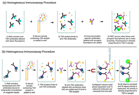 Procedural differences of homogeneous assays and heterogeneous assays for the quantitation of thyroid stimulating hormone (TSH) in a sample. Created using BioRender.com accessed on 29 October 2023. (a) Homogeneous immunoassay procedure. (1) Anti-TSH antibodies conjugated with a donor fluorophore (D) are added to a well (2) followed by the addition of sample containing TSH analyte. (3) TSH analyte from the sample binds to the anti-TSH antibodies. (4) Immunocomplex-specific antibodies conjugated with an acceptor (A) fluorophore are added and (5) bind to the TSH–anti-TSH immunocomplex, bringing the donor and acceptor fluorophores in close proximity, inducing FRET. Fluorescence is directly proportional to TSH present in sample. (b) Heterogeneous immunoassay procedure. (1) Biotinylated anti-TSH antibodies bound to immobilized streptavidin on magnetic beads are added to a well (2) followed by the addition of sample containing TSH analyte. (3) TSH analyte from the sample binds to the anti-TSH antibodies. (4) Anti-TSH antibodies labeled with acridinium ester (AE) are then added and (5) bind to TSH analyte complex. (6) A magnet induces solid phase separation by immobilizing the magnetic beads with the bound immunocomplex while (7) unbound molecules are washed and removed from the well. (8) An addition of reagents induces a chemical reaction activating the AE label and (9) AE activity is measured. AE activity is directly proportional to the TSH present in sample.