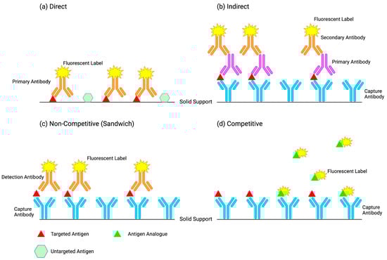 Design possibilities for quantifying thyroid stimulating hormone (TSH) in serum using heterogeneous methods. Created using BioRender.com accessed 29 October 2023. (a) Represents a direct design where the target antigen TSH is immobilized on the solid support along with other untargeted antigens from the sample matrix. An anti-TSH antibody labeled with a fluorescent probe binds specifically to the target TSH antigen only. Fluorescence is directly proportional to the amount of TSH present in sample. (b) Represents an indirect design where a primary antibody (mouse anti-TSH antibody) binds to TSH bound to a capture antibody (human anti-TSH antibody) immobilized on a solid support. A secondary antibody (anti-mouse antibody) labeled with a fluorescent probe binds to the mouse anti-TSH antibody. Fluorescence is directly proportional to the amount of TSH in the sample. (c) Represents a sandwich design where TSH is bound (“sandwiched”) between an anti-TSH capture antibody and an anti-TSH detection antibody. Capture antibody is in excess. Fluorescence is directly proportional to the amount of TSH present in sample. (d) Represents a competitive design where TSH in the sample competes with a TSH analogue labeled with a fluorescent probe for binding to an immobilized anti-TSH antibody. Detection analogue is in excess. Fluorescence is inversely proportional to the amount of TSH in the sample.