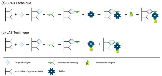 In 1979, Jean-Luc Guesdon, Therese Ternynck, and Stratis Avrameas, a team from the Institut Pasteur in France, developed the first ELISA employing the avidin–biotin system. They created two different methods by conjugating biotin to antibodies, antigens, and enzymes, which then binds to avidin to detect, immobilize, and quantify antibodies and/or antigens of interest. In the Bridged Avidin–Biotin (BRAB, Figure 3a) method, the antigen from the sample is “sandwiched” between an immobilized capture antibody and a biotin-labeled antibody. After a washing step eliminating the unbound biotin-labeled antibody, avidin is added and binds to the biotin label on the immune complex. A second washing step occurs to eliminate the unbound avidin, followed by the addition of a biotin-labeled enzyme that binds to the immobilized avidin. Lastly, a third washing step removes the unbound biotin-labeled enzyme, and the enzyme activity associated with the presence of antigen in the sample is measured. In the Labeled Avidin–Biotin (LAB, Figure 3b) technique, the antigen from the sample is bound to an immobilized antibody and a biotin-labeled antibody, just like in the BRAB technique. However, in the LAB technique, the avidin is pre-labeled with the enzyme, eliminating the need for an extra step [37].