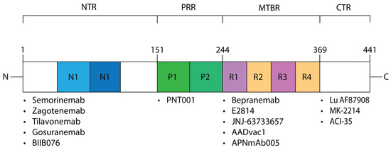 The tau protein domains mapped to antibody-based therapies. The major regions of the tau protein are depicted. The associated regions are listed with their residue count including the N-terminal region (NTR), proline-rich region (PRR), microtubule binding region (MTBR), and the C-terminal region (CTR). Immunotherapies that interact with these major domains are listed below. Note an incongruence exists with the residues listed for the MTBR described for Bepranemab and JNJ-63733657, which bind to 235–250 and 217 respectively, but are still categorized as an anti-MTBR immunotherapy.