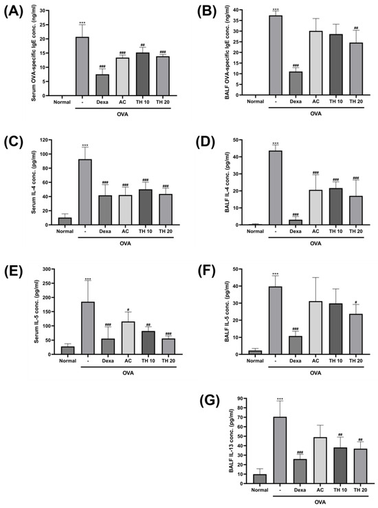 Effect of AC extract and trifuhalol A on OVA-specific IgE and allergic cytokines concentrations in serum and BALF after exposure to OVA inhalation. Measurement of average serum—(A) OVA-specific IgE, (C) IL-4, and (E) IL-5—and BALF—(B) OVA-specific IgE, (D) IL-4, (F) IL-5, (G) IL-13—concentrations using ELISA. Dexamethasone (Dexa) 1.5 mg/kg (i.p.), AC extract 100 mg/kg (p.o.), and Trifuhalol A (TH) 10 and 20 mg/kg (p.o.) were treated for each group. Data are presented as mean ± S.D. (N = 5/group). *** Significantly different (p < 0.001) from the normal group. #,##,### Significantly different (p < 0.05, p < 0.01, p < 0.001) from the OVA inhalation group.