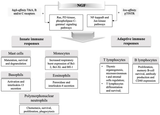 Additionally, NGF can directly influence adaptive and innate immune responses. The impact of NTs on immune cells is tightly regulated and may be influenced by other signals [104]. NTs play crucial roles in the microenvironment, stromal cells, thymic organogenesis, and T-cell survival and differentiation [105,106].