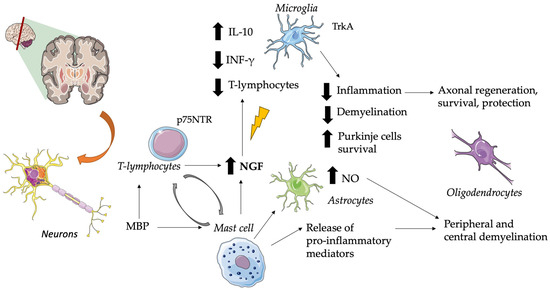 In particular, multiple sclerosis is an autoimmune demyelinating disease that produces brain plaques containing mast cells and areas of demyelination demarcated by T-lymphocytes and monocytes in cellular infiltrates [2,169]. NGF seems to produce anti-inflammatory effects by upregulating the production of interleukin 10 by glial cells, T cells infiltrating the CNS, and downregulating the production of interferon-gamma [170]. The major suspected immunogen in multiple sclerosis is the myelin basic protein (MBP) which stimulates mast cell secretion of pro-inflammatory mediators, capable of causing peripheral and central demyelination, and of cytokines that can induce astrocyte production of neurotoxic amounts of nitric oxide (NO) [171]. See Figure 2 for further information.