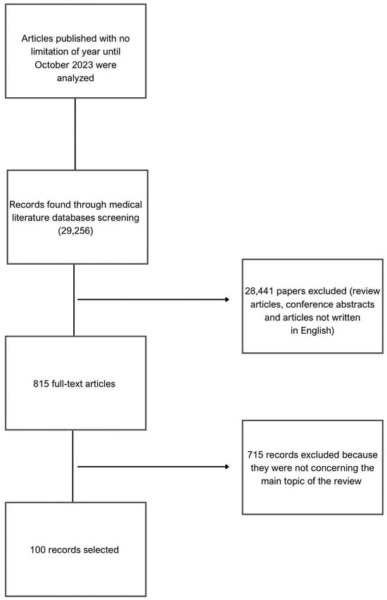 Keywords such as “breastfeeding”, “obesity”, “metabolic inflammation”, “metabolic programming”, “energy metabolism”, “immunology”, “postpartum”, “immunity”, “immune system”, and “inflammation” were used to find articles that met the goals of this review. The inclusion criteria for the papers were the following: original papers, retrospective studies, and clinical cases related to the subject. Exclusion criteria were review articles, articles not written in English, and duplicated papers. Additionally, abstracts from conferences and articles outside the subject of the review were also excluded. The detailed method of the literature selection is described in Figure 1.