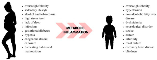 The term “metabolic programming” was introduced by Alan Lucas in 1991. His hypothesis recognizes the impact of unfavorable environmental factors on fetal metabolic programming, leading to chronic physiological changes in the fetus [55]. The “thrifty phenotype hypothesis”, proposed by Hales and Barker in 1992, suggests that a developing fetus exposed to adverse nutritional conditions adapts its organ tissue [56]. This adaptation involves changes in the structure and functioning of cells, including pancreatic beta cells (β-cells), nephrons, and cardiomyocytes. This adaptation involves changes in the structure and functioning of cells, including pancreatic beta cells (β-cells), nephrons, and cardiomyocytes, because of which these mechanisms help the fetus survive in the intrauterine environment. Consequently, this adaptation results in various complications in adulthood. For example, hypoplasia of pancreatic β-cells leads to impaired glucose tolerance (potentially resulting in type 2 diabetes), and a reduced number of nephrons increases the risk of hypertension. Moreover, permanently altered metabolism activates mechanisms responsible for fat tissue deposition after birth, potentially leading to metabolic disorders and obesity [50,51,54,56]. The process of the influence of metabolic inflammation on metabolic programming is shown in Figure 2.