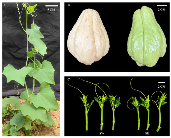 Sechium edule (Jacq.) Swartz, a perennial persistent climbing herb of the genus Sechium in the family Cucurbitaceae, was originally from Mexico and other Central and South American countries [1]. It was introduced to China in the early 19th century and is now widely cultivated in Guangdong, Yunnan, Zhejiang, Fujian, and Taiwan [2]. Its edible fruit, popularly known as chayote, has the advantages of fast growth and high yield, making it one of the important vegetables in the South China region [3]. In addition to the fruit, the tender shoot, known as the chaylte vine, is also edible [4]. The chaylte vine is rich in vitamins, carotenoids, flavonoids, and mineral elements. The vine’s crisp texture and unique flavor make it suitable for stir-fried or blanched food, therefore gaining popularity in Southwest China and Southeast Asian countries [4,5].