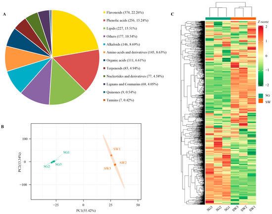 The classes with the highest number of components detected were flavonoids (374, 22.26%), phenolic acids (256, 15.24%), and lipids (227, 13.51%). These three metabolite classes combined accounted for more than half of all the detections and can be considered the most important components of chaylte vines. Specifically, the green-skinned variety (SG) contained eight unique metabolites consisting of five flavonoids (quercetin-5,4′-di-O-glucoside, vitexin-7-O-(6″-feruloyl)glucoside, kaempferol-3-O-arabinoside, Okanin-4′-O-glucosyl-O-glucoside, and okanin-3′,4′-di-O-glucoside*), two phenolic acids (calceolarioside A and 2-hydroxy-3-phenylpropanoic acid), and one organic acid (nonanoic acid), while the white-skinned variety (SW) had four unique metabolites, including two flavonoids (choerospondin and Limocitrin-3-O-galactoside), one phenolic acid (isoeugenol), and one alkaloid (4-aminoindole) (Table S3). In contrast, the number of detected metabolites shared by the two groups of samples, SG and SW, was as high as 1668. This indicates that there is no significant difference between the two varieties in terms of metabolite species. Therefore, it can be hypothesized that the differences in the metabolite levels between the two sample groups primarily reflect variations in metabolite accumulation rather than species composition.