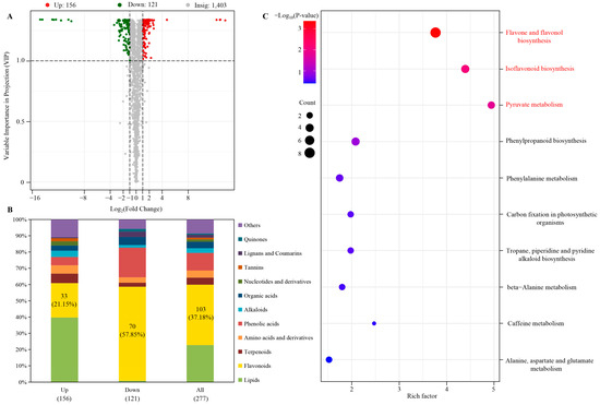 (A) Volcano plot of DAMs between two varieties of chaylte vines. (B) Classification and proportion of DAMs. (C) KEGG enrichment analysis of DAMs. Pathways with significant enrichment are highlighted in red.