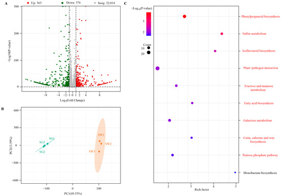 The FPKM method was used to determine the expression level of the genes. PCA analysis of the gene expression levels revealed a significant separation between the SW and SG samples with some aggregation observed within each sample (Figure 4B). This suggests that the sequencing results are suitable for the subsequent analysis of differential gene expression. By comparing the two samples, a total of 739 DEGs were identified. Specifically, 363 genes were up-regulated and 376 genes were down-regulated in the SW group compared to the SG group (Figure 4A; Table S5).