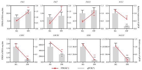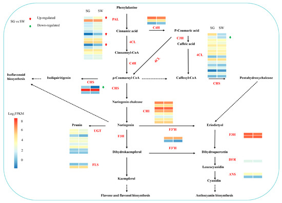 In summary, the diversity of flavonoid subclasses in the SG samples was better than that of the SW samples despite the higher total flavonoid content in the SW samples. This inconsistency may be attributed to the differential expression of the PAL and CHS genes in the respective samples.