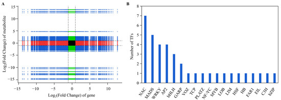 (A) Nine-quadrant diagram of correlation between genes and metabolites. (B) Transcription factors (TFs) in quadrants 1, 3, 7, and 9.