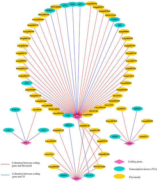 Figure 8 illustrates strong correlations between the four structural genes involved in the flavonoid biosynthesis pathway (PAL1, PAL7, 4CL2, and CHS1) and 46 flavonoid metabolites. PAL1, an initiation gene for flavonoid biosynthesis, was found to be associated with 39 flavonoids and 9 transcription factors (TFs). It is noteworthy that the number of flavonoids and TFs associated with PAL1 is significantly higher compared to the other PAL gene, PAL7. Similarly, 4CL2 and CHS1 were both associated with 10 flavonoids and 6 transcription factors. This indicates that these four upstream structural genes, potentially regulated by specific TFs such as NAC, MADS, WRKY, and MYB, play a critical role in the biosynthesis of flavonoids in chaylte vines.