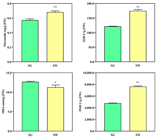 The content of total flavonoids and the activity of the protective enzymes of two varieties of chaylte vines were determined to gain insights into physiological indicators (Figure 9). The results revealed that the content of total flavonoids in the SW samples (0.68 mg/g) was significantly higher compared to the SG samples (0.57 mg/g). Additionally, the SOD and POD activities of the SW samples were both significantly higher than those of the SG samples. Specifically, the SOD activity of the SW samples was 174.89 U/g, while that of the SG samples was only 121.51 U/g. Similarly, the POD activity of the SW samples was 7638.13 U/g, while that of the SG samples was only 4772.80 U/g. Additionally, the content of MDA in the SW samples (11.26 nmol/g) was significantly lower than that in the SG samples (12.67 nmol/g). These findings indicate that the SW samples exhibited a higher total flavonoid content and greater antioxidant capacity than the SG samples.