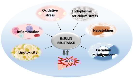 Insulin resistance is defined as an inadequate response of target tissues to insulin stimulation, primarily the liver, adipose tissue, and muscles. Excess fat accumulation seems to be the major triggering factor for insulin resistance development. At the beginning, low-grade inflammation occurs in adipose tissue, which further contributes to insulin resistance development, firstly in adipose tissue and then in the liver, leading to MASLD development. MASLD tends to progress in NASH due to oxidative stress and inflammation that occur in the liver, which, together with lipotoxicity, aggravate insulin resistance, forming a vicious circle. Recent studies have pointed to hepatokines’ important role in communication between the liver and target organs, such as adipose tissue and muscles. Nowadays, ER stress is considered a very interesting contributor in the pathogenesis of metabolic disorders such as MetS and MASLD, and therefore, many therapeutic strategies are oriented toward targeting UPR components. In addition, pharmacological studies intend to modulate and recover biological clock and circadian dysrhythmia, which have been shown to significantly affect lipid and glucose metabolism. However, it is still necessary to investigate novel and more precise molecular mechanisms and signaling pathways that bidirectionally connect MASLD and insulin resistance.