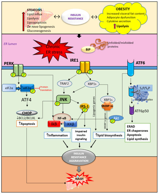 The role of ER stress and UPR activation in insulin resistance and NASH development. Obesity and liver steatosis are bidirectionally connected with insulin resistance and are known to induce ER stress and consequently UPR activation. UPR is mediated through three pathways. The accumulation of unfolded and/or misfolded proteins trigger the activation of UPR. The activation and phosphorylation of IRE1, PERK, and ATF6 trigger an inflammatory response through JNK/NF-κB activation. Furthermore, impaired insulin signaling is mediated by the phosphorylation of IRS-1 mediated by JNK activation. In addition, ER stress triggers upregulation of the SREBP 1c receptor which contributes to lipid biosynthesis and accumulation. Accompanied by increased apoptosis of hepatocytes, these mechanisms are responsible, at least partly, for the insulin resistance aggravation contributing to NASH development. ER—endoplasmic reticulum, BiP—immunoglobulin heavy chain-binding protein, IRE1—inositol-requiring enzyme, PERK—PKR-like ER kinase, ATF6—activating transcription factor 6, eIF2α—eukaryotic initiation factor-2α, CHOP—C/EBP homologous protein, XBP1—XBP1, X-box binding protein 1, TRAF2—TNF receptor-associated factor 2, JNK—c-jun-N-terminal kinase, IRS1—insulin receptor substrate-1, ERAD—ER-associated degradation, SREBP—sterol regulatory element binding protein, IκB—inhibitor of nuclear factor kappa B, NF-κB—nuclear factor kappa B, and IKKβ—inhibitor of nuclear factor kappa-B kinase subunit beta.