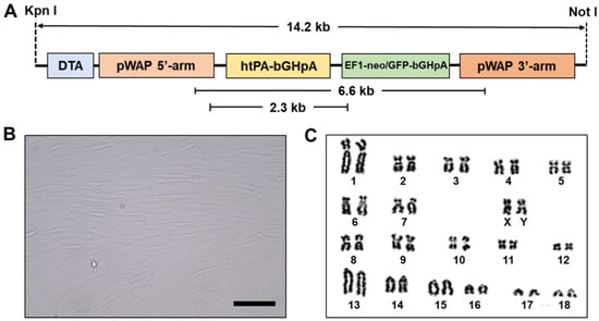 In the present study, we generated a transgenic cell line with a normal karyotype that expresses htPA using a WAP promoter. It is well known that the htPA activates the dissolution of cellulose that makes blood clots to be broken down and helps supply and circulation blood []. Thus, recombinant tPA is currently used as the standard treatment for acute ischemic stroke, pulmonary embolism, and myocardial infarction [,]. Therefore, many attempts to generate the htPA transgenic animals, as those in the present study, were conducted in many species including mice [], rats [], goats [], cows [], rabbits [], and pigs []. The WAP promoter applied in the present study (Figure 1A) is a mammary gland-specific promoter that of the WAP protein regulates the proliferation of mammalian epithelial cells []. The WAP protein is specifically expressed in the mammary gland and is controlled by hormones and developmental signals during pregnancy []. Many studies have confirmed that the mammary glands of transgenic animals can serve as bioreactors to produce valuable therapeutic proteins [,,].