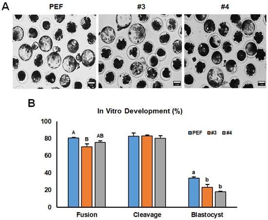 As shown in Figure 2A, three groups of cloned embryos were generated with #3, #4, and PEF cells as donors. The morphology of each blastocyst from the three groups was comparable while the fusion rate in the #3 group (70.3%) was lower significantly (p < 0.05) than other two groups (#4; 75.6% and PEF; 80.7%) as shown in Figure 2B. Although there was no significant difference in cleavage rate between all groups (#3; 83.0%, #4; 80.3%, PEF; 82.7%), the blastocyst formation rates were decreased significantly in groups #3 (23.1%) and #4 (18.1%) compared to the PEF group (33.9%).