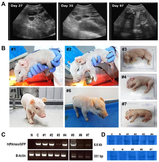 Confirmation of cloned htPA piglets. (A) Representative pregnancy diagnosis by ultrasound on days 27, 35, and 97. (B) Representative litter sizes of the #3 group (#1 to #4) and #4 group (#5 to #7). (C) Confirmation of transgene expression by PCR. (D) Confirmation of transgene expression by Southern blotting analysis. N; PEF cells (wild type), C; htPA transfected donor cells, #1 to #7; tissues from cloned piglets. The #1, #6, and #7 piglets have macroglossia-like phenotypes.