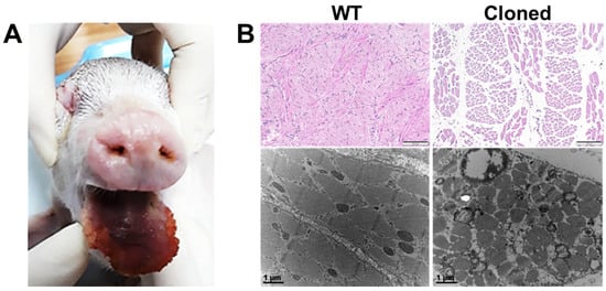 Histological images of abnormal tongue tissues in cloned piglets. (A) The phenotype of the abnormal macroglossia-like tongue. (B) Representative images after hematoxylin and eosin staining (upper) and transmission electron microscopy (lower) of tongue tissues. WT: tissues from wild-type piglets, Cloned: tissues from cloned piglets. Bars = 100 μm (upper) and 1 μm (lower).