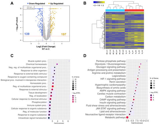 Transcriptome analysis of tongue tissues from cloned piglets. (A) Volcano plotting analysis of 197 upregulated genes and 139 downregulated genes. (B) Heat map analysis from the one-way hierarchical clustering of up and down-regulated DEGs using the Euclidean method and complete linkage. (C) Gene ontology (GO) analysis to identify biological processes. (D) KEGG pathway analysis. The results of GO and KEGG analysis were carried out by using the ShinyGO 0.77 (http://bioinformatics.sdstate.edu (accessed on 1 March 2023)) with selection by FDR and sorting by fold enrichment. C; wild type, NT; cloned piglet, Neg; negative, Proc; process, Reg; regulation.