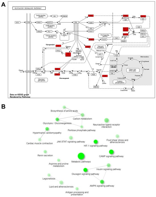 As shown in Figure 6A, DEGs highlighted in red rectangle were observed to be associated with the glucagon signaling pathway. The interactive enrichment network was examined using the results from the KEGG pathway analysis (Figure 6B). The glucagon signaling pathway was found to intersect significantly with the insulin, glucagon, and adenosine monophosphate-activated protein kinase signaling pathways, along with strong interactions with pentose phosphate, amino acid biosynthesis, glycolysis, and carbon metabolism.
