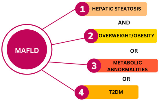 Metabolic-associated fatty liver disease (MAFLD) is the new term related to nonalcoholic fatty liver disease (NAFLD). MAFLD was suggested by experts of The International Consensus Panel of MAFLD in 2020. MAFLD emphasizes the importance of metabolic factors in the development and progression of liver disease. The criteria for MAFLD include the presence of hepatic steatosis in addition to one of the following three criteria: overweight or obesity, presence of type 2 diabetes mellitus (T2DM), or evidence of metabolic dysregulation (Figure 1). Since the association of metabolic syndrome and fatty liver is common, it has been suggested that a new term, MAFLD, is more appropriate. If the specific criteria are present, the diagnosis of MAFLD can be made regardless of alcohol consumption and previous liver disease [1,2].