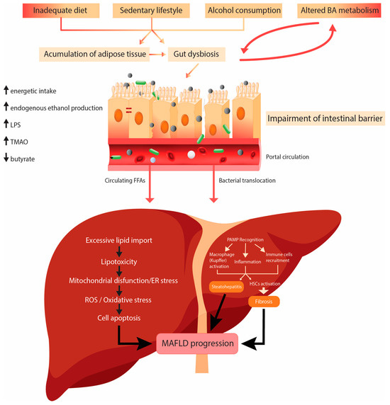 In addition to the previously corroborated pathophysiological mechanisms, there is no talk of MAFLD without mentioning the term gut–liver axis, the bidirectional communication between the intestines and the liver. Being more than mere interorgan connection, the gut–liver axis also includes the complex interplay between the immune system and the gut microbiota [35]. There are several entities stretching along the gut–liver axis, with gut microbiota as the main intersection in this interorgan communication. The role of microbiota in MAFLD development and evolution can be substantiated by several mechanisms, which are discussed in the following section.
