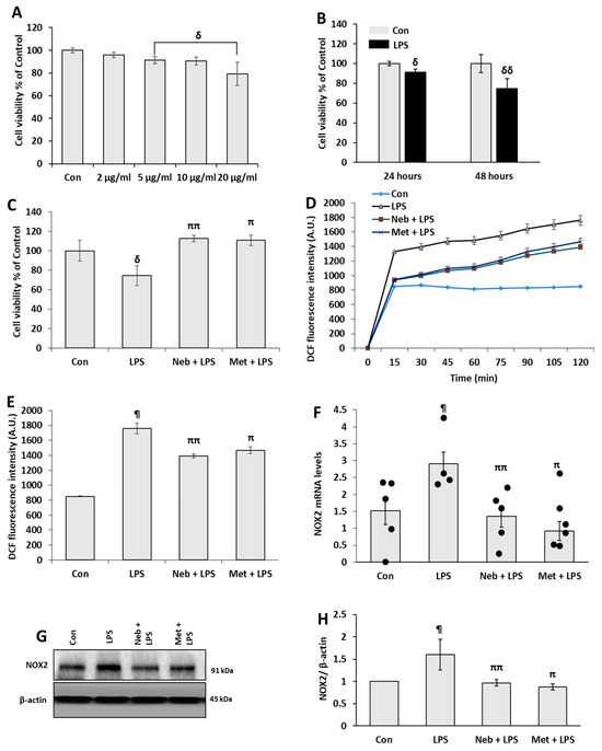 Figure 1. Neb and Met reduced LPS-induced cytotoxicity and ROS generation in H9c2 cells: (A). The cytotoxicity effect of increasing LPS concentrations on H9c2 using cell titer assay. (B). The cytotoxic effect of 5 µg/mL LPS for 24 and 48 h obtained by cell titer assay. (C). Cell viability results were obtained by cell titer assay following treatment with Neb 1 µM, and Met 10 µM in the presence or absence of LPS. (D,E) ROS generation was evaluated by DCFDA fluorescence. LPS treatment raised DCF fluorescence, which was markedly reduced by neb and met pretreatment. (F) mRNA levels of NOX2 were downregulated by pretreatment with both Neb and Met. (G,H) The immunoblot and corresponding histogram illustrate the protein expression of NOX2, β-actin was used as an internal control. δ p < 0.02, δδ p < 0.01, p < 0.05 vs. untreated (Con), ππ p < 0.02, π p < 0.05 vs. LPS. Values are presented as means ± SEM N ≥ 6 for each treatment group.