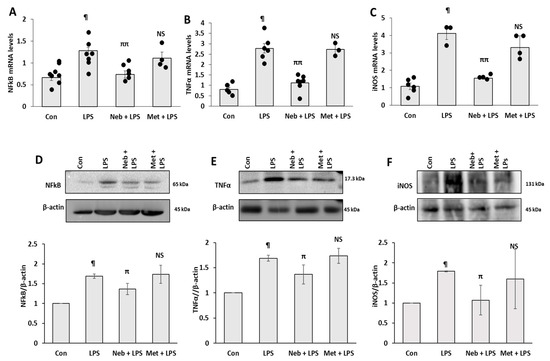Figure 2. Neb but not Met reduced the gene and protein expressions of inflammatory markers in LPS-stimulated H9c2 cells: Downregulation of mRNA expression levels of NF-κB (A), TNF-α (B) and iNOS (C) by Neb but not Met. (DF). The immunoblots and corresponding histograms illustrate the expression of NFkB, TNFα and iNOS respectively. β-actin was used as an internal control. p < 0.05 vs. Con, ππ p < 0.02, π p < 0.05 vs. LPS. and NS nonsignificant vs. LPS. Values are presented as means ± SEM N ≥ 6 for each treatment group.